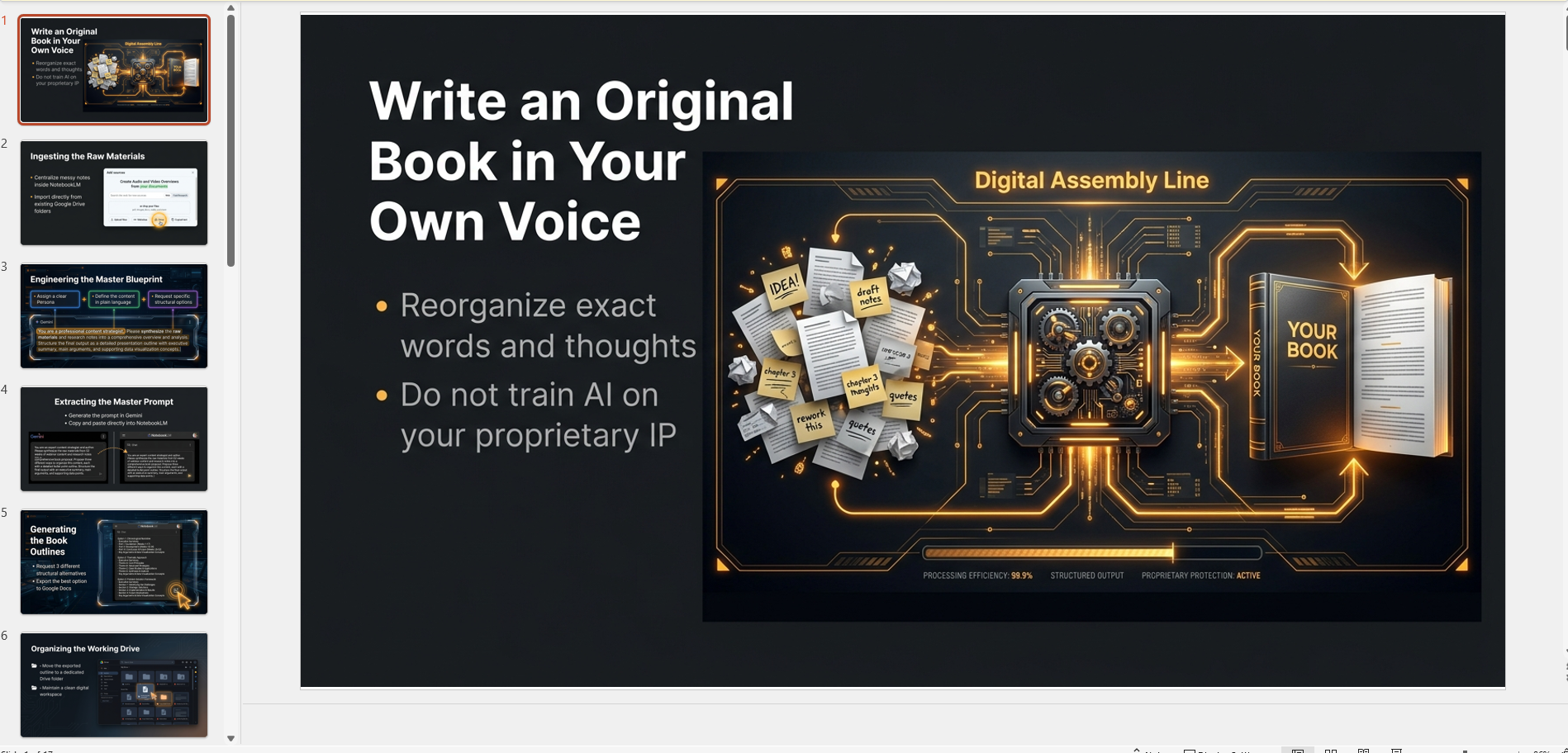 This workflow demonstrates exactly how to turn NotebookLM into a structured book publishing engine that meticulously preserves your exact words and original thoughts. It outlines a precise system for capturing raw audio notes, organizing them in Google Drive, and using targeted prompt engineering to force NotebookLM to draft comprehensive chapters rather than its default summaries. This entirely eliminates the friction of generic AI rewriting and protects the creator's authentic voice.